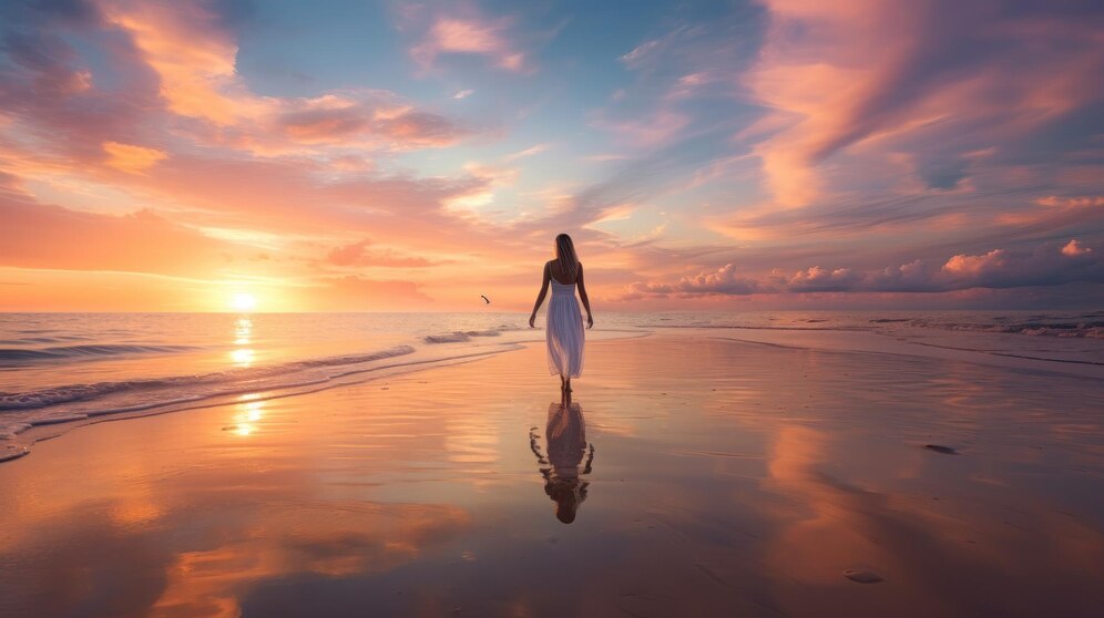 Observo nossos pés se tocarem na umidade da areia em um contínuo existencial, e percebo que sou esse ser sutil e angelical, e também, o ser denso e físico que o observa. Nós nos tocamos e nos entrelaçamos numa unidade — dois seres criando uma realidade, duas entidades evoluindo em comunhão. Existimos neste momento uma para a outra, vivendo um amor que transcende dimensões e mundos, e assim, nos tornamos uma.